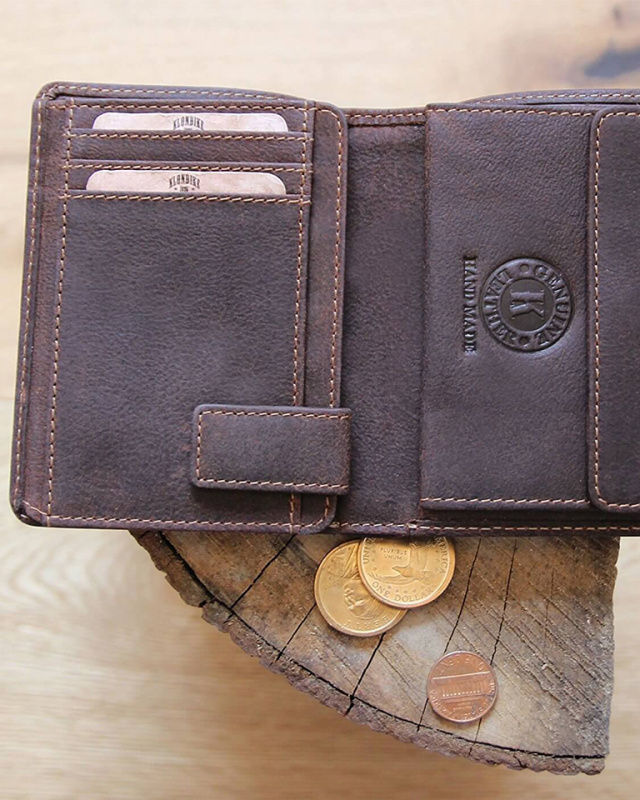 • Бумажник высочайшего качества фирмы «Klondike» сделан из натуральной кожи и обеспечивает безопасное хранение купюр, монет, кредитных карт, удостоверения личности и документов за счет удобных отделений.