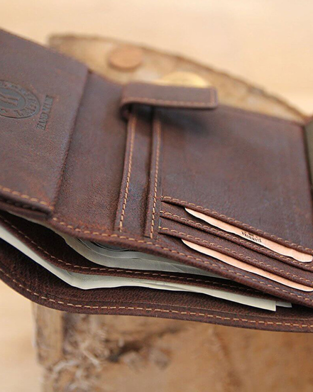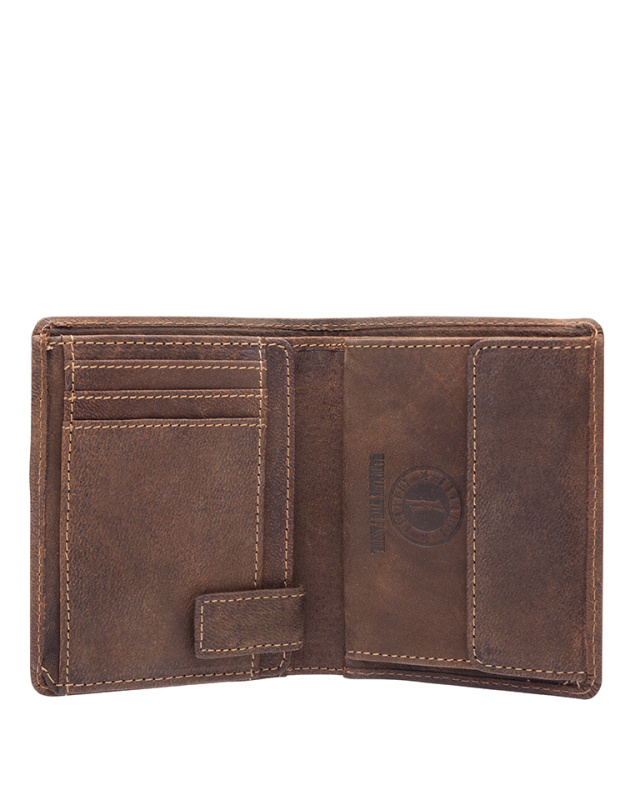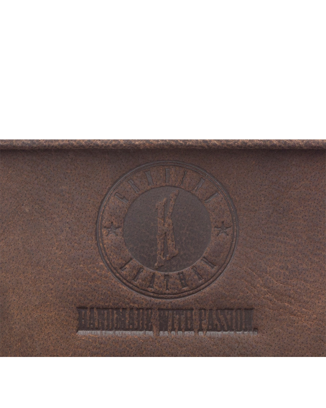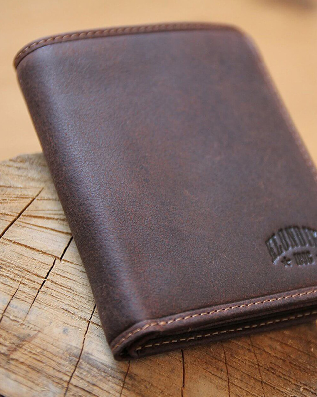 • Благодаря своим размерам (ширина – около 9,5 см; высота – около 12 см), бумажник «Klondike» прекрасно уместится в кармане любых брюк. Кожаный ремешок с заклепкой предоставит содержимому Вашего бумажника дополнительную защиту.