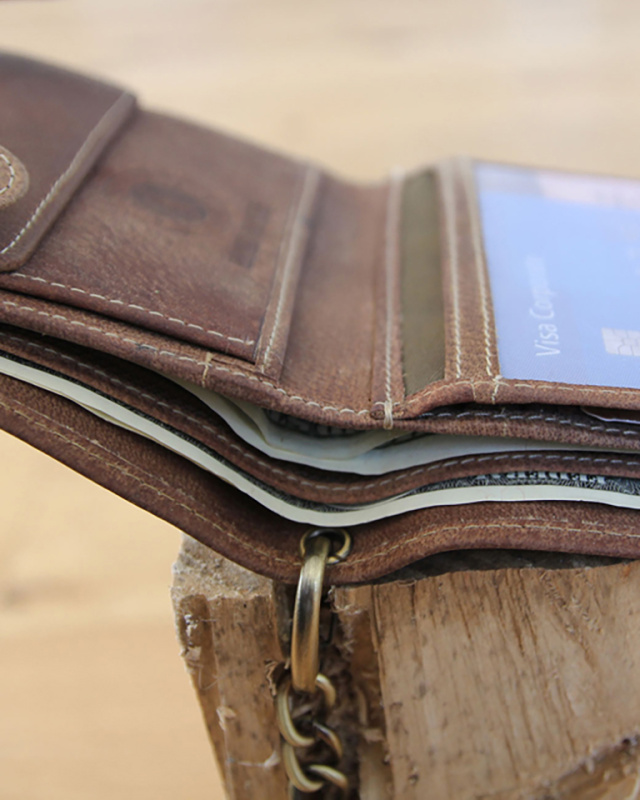 Функциональная организация: 6 отделений для кредитных карт, 2 отделения для купюр, 3 кармана, отделение для мелочи, 2 сетчатых отделения, карман на молнии, металлическая цепочка с карабином для крепления к поясу