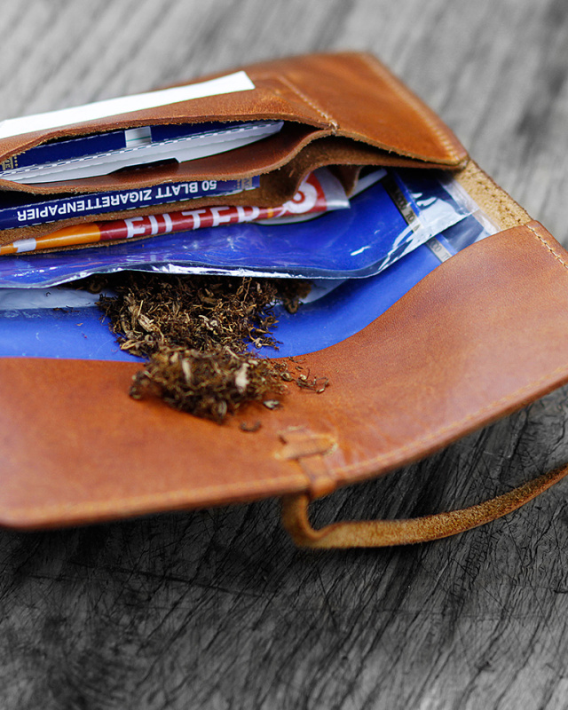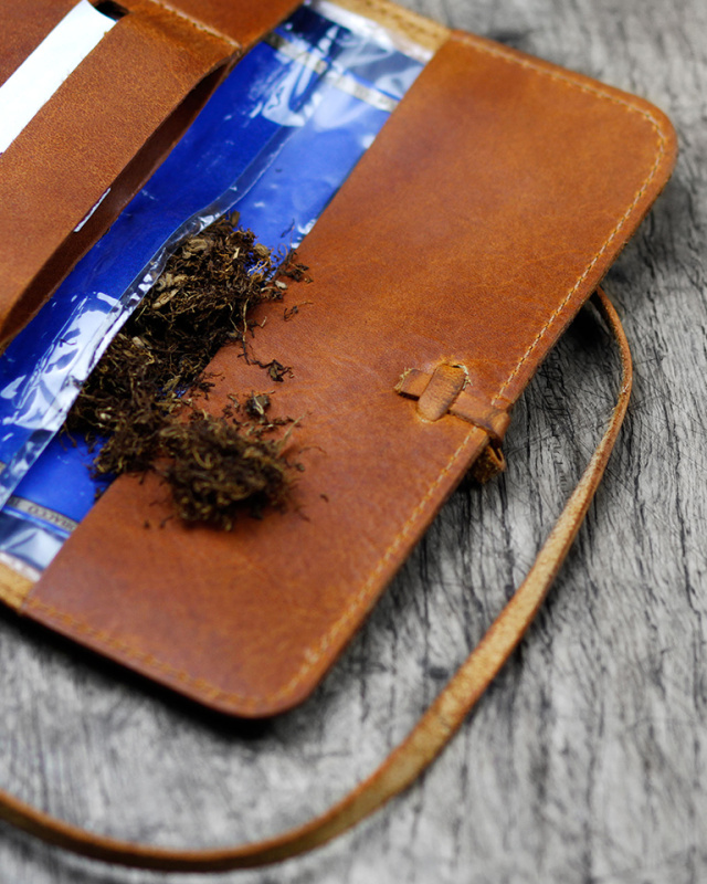 Функциональная организация: основное отделение с карманом для табака, отделение для сигаретной бумаги, карман для фильтров, кожаный ремешок для фиксации.