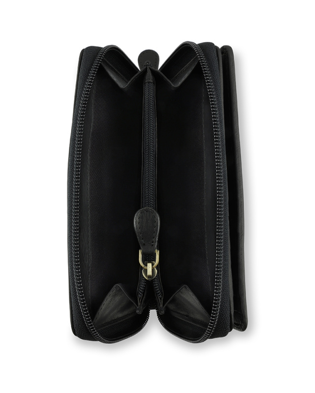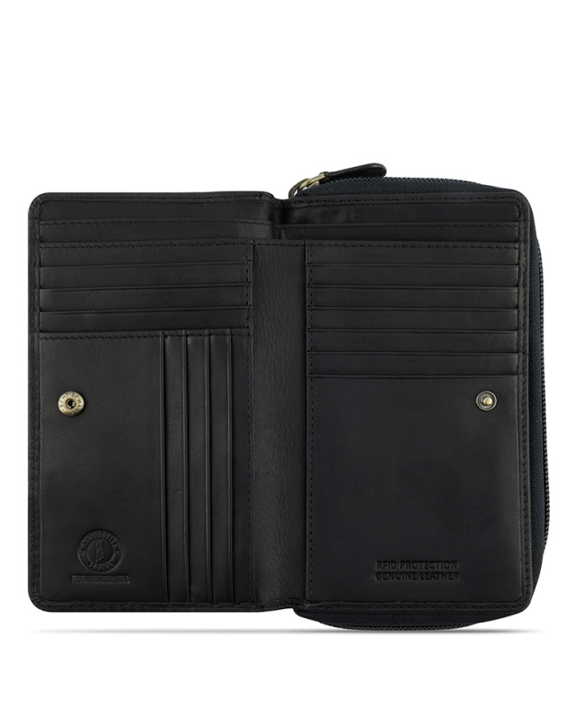 Функциональная организация: основное отделение на молнии и кнопке, 2 отделения для купюр, 14 слотов для кредитных карт, 4 кармана, отделение для монет, защита от сканирования RFID.