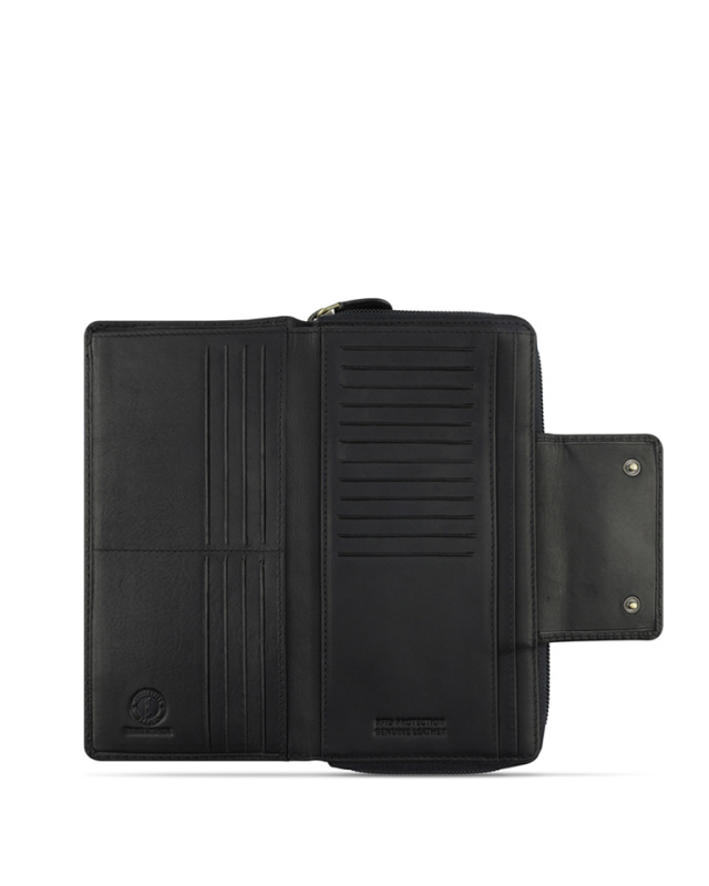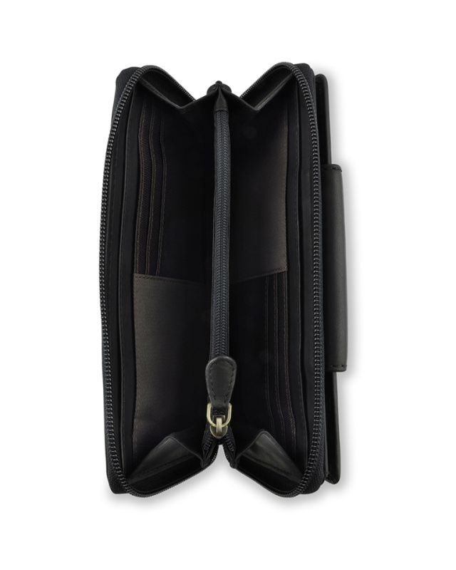 Функциональная организация: основное отделение на молнии и 2 кнопках, отделение для купюр, 24 отделения для кредитных карт, 10 карманов, отделение для монет, защита от сканирования RFID