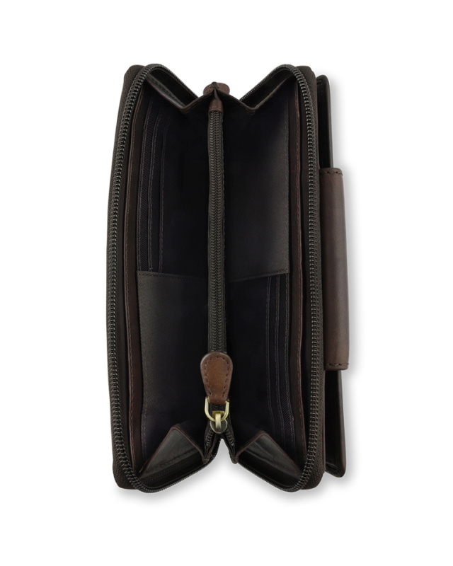 Функциональная организация: основное отделение на молнии и 2 кнопках, отделение для купюр, 24 отделения для кредитных карт, 10 карманов, отделение для монет, защита от сканирования RFID