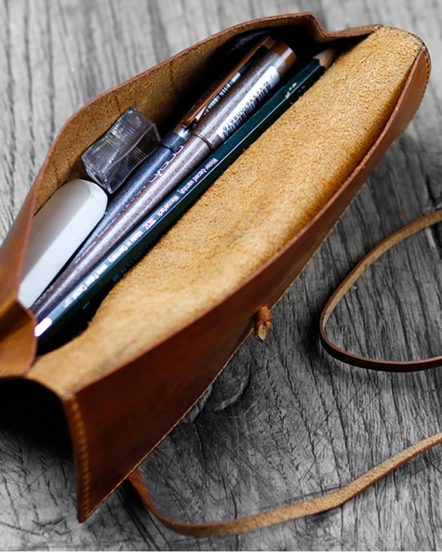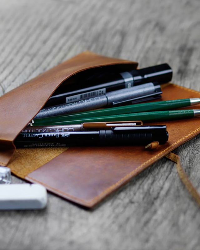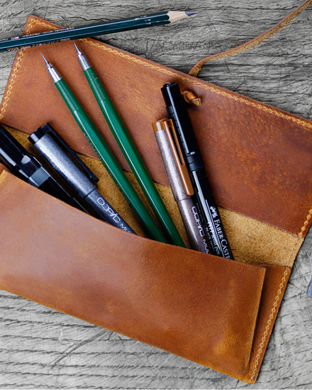 Функциональная организация: 1 вместительное отделение для ручек, карандашей, ластиков, точилок и многого другого, кожаный ремешок для фиксации