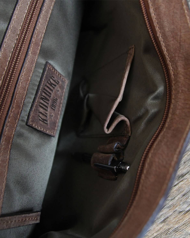 - Элегантное тиснение «Klondike» на лицевой стороне и небольшое, ненавязчивое тиснение c надписью 'made with passion' на тыльной стороне, мастерски сделаны вручную на высочайшем уровне. Дополнительный кожаный ремень сзади позволяет прикреплять сумку к чемодану.